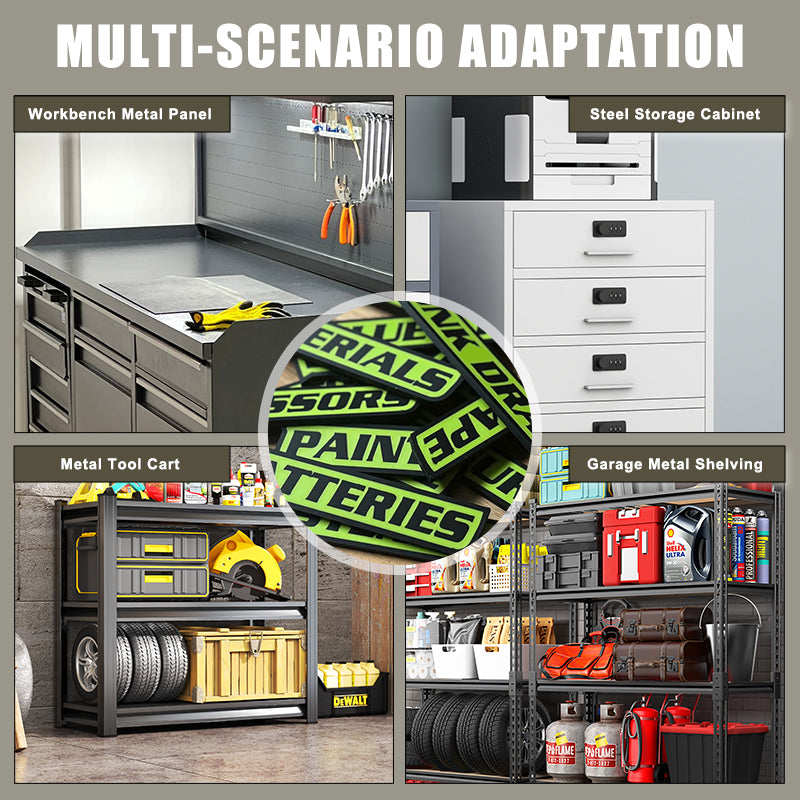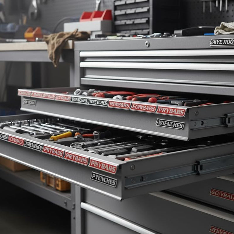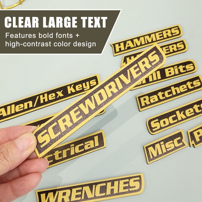 Bruk av tydelig typografi + kontrastfarger: 🔹 Finn skiftenøkkelen umiddelbart 🔹 Finn skrutrekkeren på få sekunder 🔹 Merkbar forbedring av arbeidseffektiviteten